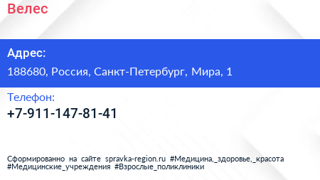Велес по адресу 188680, Россия, Санкт-Петербург, Мира, 1 в дальнейшем Организация, размещена в следующих категориях: