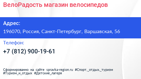 ВелоРадость, магазин велосипедов по адресу 196070, Россия, Санкт-Петербург, Варшавская, 56 в дальнейшем Организация, размещена в следующих категориях: