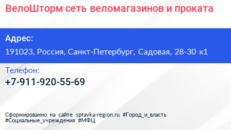 ВелоШторм, сеть веломагазинов и проката по адресу 191023, Россия, Санкт-Петербург, Садовая, 28-30 к1 в дальнейшем Организация, размещена в следующих категориях: