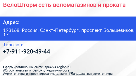 ВелоШторм, сеть веломагазинов и проката по адресу 193168, Россия, Санкт-Петербург, проспект Большевиков, 17 в дальнейшем Организация, размещена в следующих категориях: