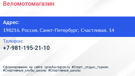 Веломотомагазин по адресу 198216, Россия, Санкт-Петербург, Счастливая, 14 в дальнейшем Организация, размещена в следующих категориях: