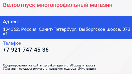 Велоотпуск, многопрофильный магазин по адресу 194362, Россия, Санкт-Петербург, Выборгское шоссе, 373 к1 в дальнейшем Организация, размещена в следующих категориях: