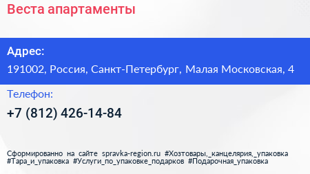 Веста, апартаменты по адресу 191002, Россия, Санкт-Петербург, Малая Московская, 4 в дальнейшем Организация, размещена в следующих категориях: