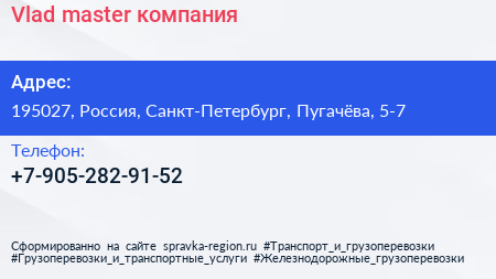 Vlad-master, компания по адресу 195027, Россия, Санкт-Петербург, Пугачёва, 5-7 в дальнейшем Организация, размещена в следующих категориях: