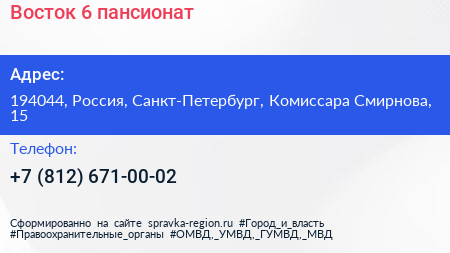 Восток-6, пансионат по адресу 194044, Россия, Санкт-Петербург, Комиссара Смирнова, 15 в дальнейшем Организация, размещена в следующих категориях: