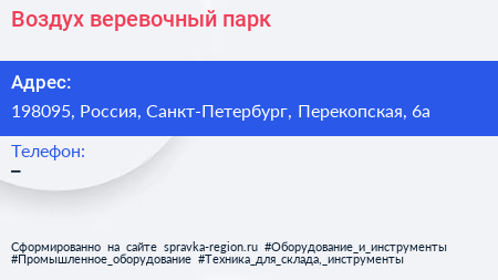 Воздух, веревочный парк по адресу 198095, Россия, Санкт-Петербург, Перекопская, 6а в дальнейшем Организация, размещена в следующих категориях: