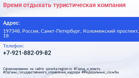 Время отдыхать, туристическая компания по адресу 197348, Россия, Санкт-Петербург, Коломяжский проспект, 18 в дальнейшем Организация, размещена в следующих категориях: