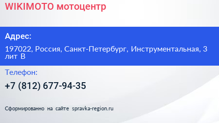 WIKIMOTO, мотоцентр по адресу 197022, Россия, Санкт-Петербург, Инструментальная, 3 лит В в дальнейшем Организация, размещена в следующих категориях: