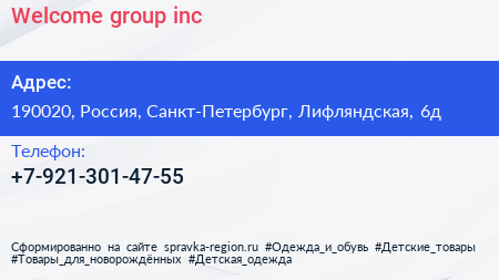 Welcome group inc по адресу 190020, Россия, Санкт-Петербург, Лифляндская, 6д в дальнейшем Организация, размещена в следующих категориях: