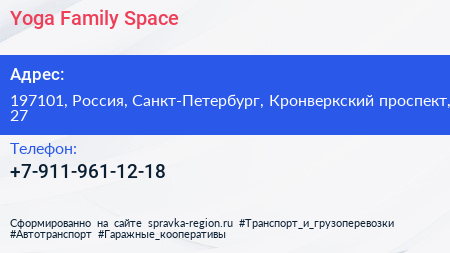 Yoga Family Space по адресу 197101, Россия, Санкт-Петербург, Кронверкский проспект, 27 в дальнейшем Организация, размещена в следующих категориях: