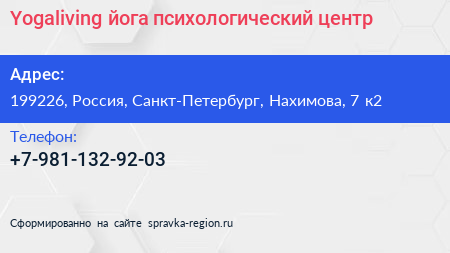 Yogaliving, йога-психологический центр по адресу 199226, Россия, Санкт-Петербург, Нахимова, 7 к2 в дальнейшем Организация, размещена в следующих категориях:
