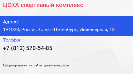 ЦСКА, спортивный комплекс по адресу 191023, Россия, Санкт-Петербург, Инженерная, 13 в дальнейшем Организация, размещена в следующих категориях: