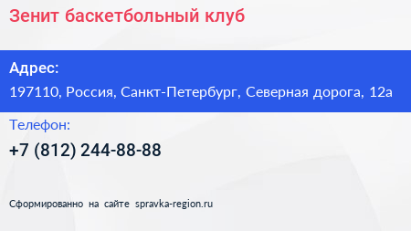 Зенит, баскетбольный клуб по адресу 197110, Россия, Санкт-Петербург, Северная дорога, 12а в дальнейшем Организация, размещена в следующих категориях: