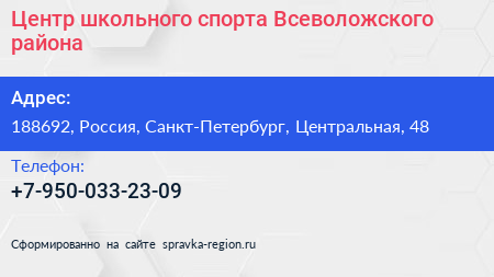 Центр школьного спорта Всеволожского района по адресу 188692, Россия, Санкт-Петербург, Центральная, 48 в дальнейшем Организация, размещена в следующих категориях: