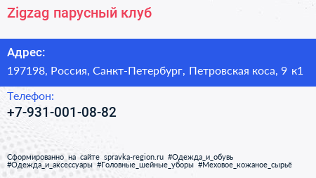 Zigzag, парусный клуб по адресу 197198, Россия, Санкт-Петербург, Петровская коса, 9 к1 в дальнейшем Организация, размещена в следующих категориях: