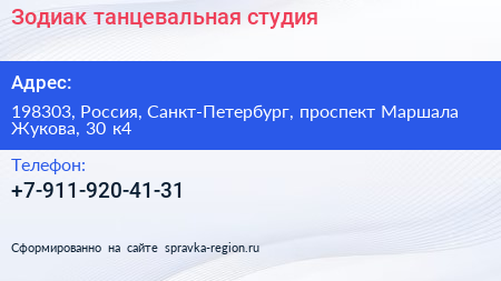 Зодиак, танцевальная студия по адресу 198303, Россия, Санкт-Петербург, проспект Маршала Жукова, 30 к4 в дальнейшем Организация, размещена в следующих категориях: