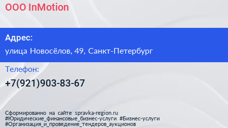 ООО InMotion по адресу улица Новосёлов, 49, Санкт-Петербург в дальнейшем Организация, размещена в следующих категориях: