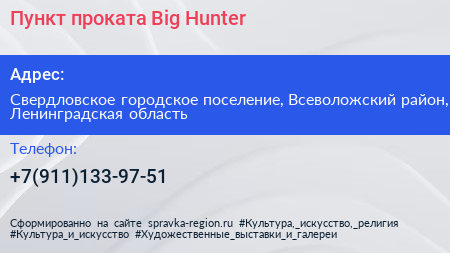 Пункт проката Big Hunter по адресу Свердловское городское поселение, Всеволожский район, Ленинградская область в дальнейшем Организация, размещена в следующих категориях: