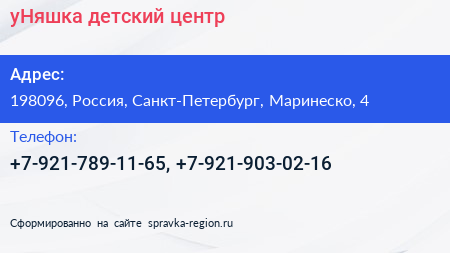 уНяшка, детский центр по адресу 198096, Россия, Санкт-Петербург, Маринеско, 4 в дальнейшем Организация, размещена в следующих категориях: