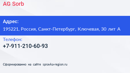 AG-Sorb по адресу 195221, Россия, Санкт-Петербург, Ключевая, 30 лит А в дальнейшем Организация, размещена в следующих категориях: