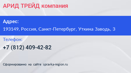 АРИД-ТРЕЙД, компания по адресу 193149, Россия, Санкт-Петербург, Уткина Заводь, 3 в дальнейшем Организация, размещена в следующих категориях: