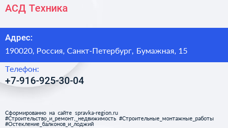 АСД-Техника по адресу 190020, Россия, Санкт-Петербург, Бумажная, 15 в дальнейшем Организация, размещена в следующих категориях: