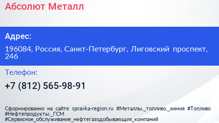 Абсолют Металл по адресу 196084, Россия, Санкт-Петербург, Лиговский проспект, 246 в дальнейшем Организация, размещена в следующих категориях: