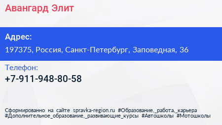 Авангард-Элит по адресу 197375, Россия, Санкт-Петербург, Заповедная, 36 в дальнейшем Организация, размещена в следующих категориях: