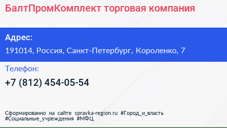 БалтПромКомплект, торговая компания по адресу 191014, Россия, Санкт-Петербург, Короленко, 7 в дальнейшем Организация, размещена в следующих категориях: