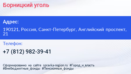 Борницкий уголь по адресу 190121, Россия, Санкт-Петербург, Английский проспект, 21 в дальнейшем Организация, размещена в следующих категориях: