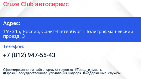 Cruze Club, автосервис по адресу 197345, Россия, Санкт-Петербург, Полиграфмашевский проезд, 3 в дальнейшем Организация, размещена в следующих категориях: