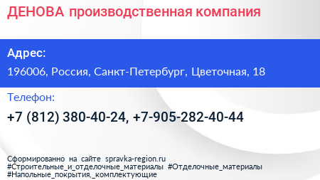 ДЕНОВА, производственная компания по адресу 196006, Россия, Санкт-Петербург, Цветочная, 18 в дальнейшем Организация, размещена в следующих категориях: