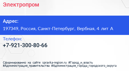 Электропром по адресу 197349, Россия, Санкт-Петербург, Вербная, 4 лит А в дальнейшем Организация, размещена в следующих категориях: