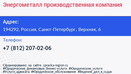 Энергометалл, производственная компания по адресу 194292, Россия, Санкт-Петербург, Верхняя, 6 в дальнейшем Организация, размещена в следующих категориях: