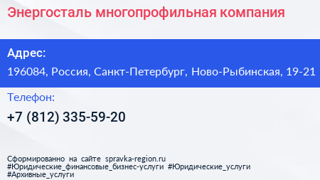 Энергосталь, многопрофильная компания по адресу 196084, Россия, Санкт-Петербург, Ново-Рыбинская, 19-21 в дальнейшем Организация, размещена в следующих категориях:
