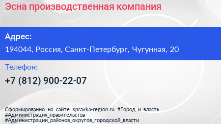 Эсна, производственная компания по адресу 194044, Россия, Санкт-Петербург, Чугунная, 20 в дальнейшем Организация, размещена в следующих категориях: