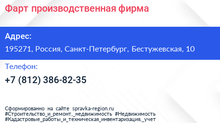 Фарт, производственная фирма по адресу 195271, Россия, Санкт-Петербург, Бестужевская, 10 в дальнейшем Организация, размещена в следующих категориях:
