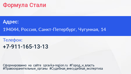 Формула Стали по адресу 194044, Россия, Санкт-Петербург, Чугунная, 14 в дальнейшем Организация, размещена в следующих категориях: