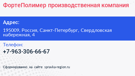 ФортеПолимер, производственная компания по адресу 195009, Россия, Санкт-Петербург, Свердловская набережная, 4 в дальнейшем Организация, размещена в следующих категориях: