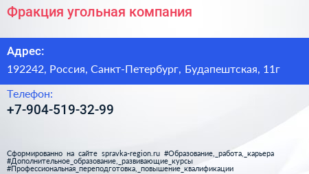 Фракция, угольная компания по адресу 192242, Россия, Санкт-Петербург, Будапештская, 11г в дальнейшем Организация, размещена в следующих категориях: