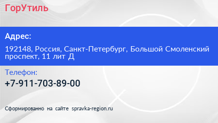 ГорУтиль по адресу 192148, Россия, Санкт-Петербург, Большой Смоленский проспект, 11 лит Д в дальнейшем Организация, размещена в следующих категориях: