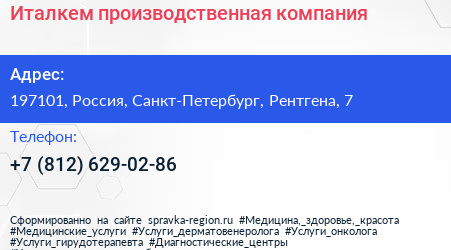 Италкем, производственная компания по адресу 197101, Россия, Санкт-Петербург, Рентгена, 7 в дальнейшем Организация, размещена в следующих категориях: