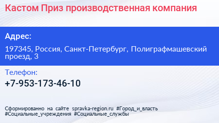 Кастом Приз, производственная компания по адресу 197345, Россия, Санкт-Петербург, Полиграфмашевский проезд, 3 в дальнейшем Организация, размещена в следующих категориях: