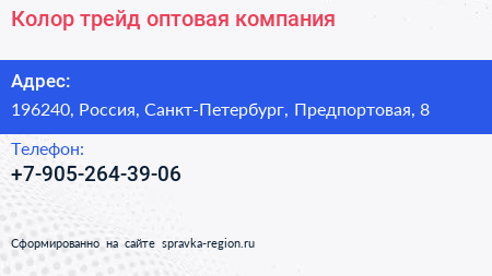 Колор трейд, оптовая компания по адресу 196240, Россия, Санкт-Петербург, Предпортовая, 8 в дальнейшем Организация, размещена в следующих категориях: