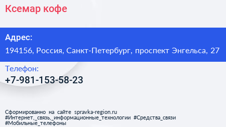 Ксемар-кофе по адресу 194156, Россия, Санкт-Петербург, проспект Энгельса, 27 в дальнейшем Организация, размещена в следующих категориях: