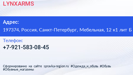 LYNXARMS по адресу 197374, Россия, Санкт-Петербург, Мебельная, 12 к1 лит Б в дальнейшем Организация, размещена в следующих категориях: