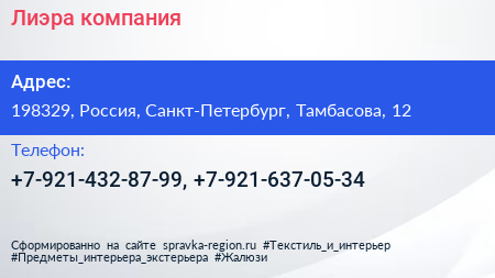 Лиэра, компания по адресу 198329, Россия, Санкт-Петербург, Тамбасова, 12 в дальнейшем Организация, размещена в следующих категориях: