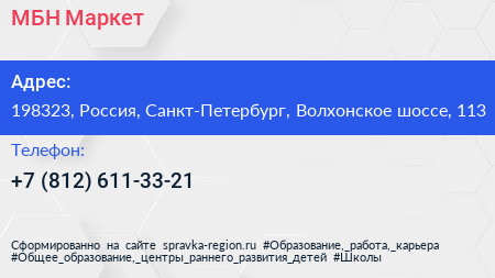 МБН Маркет по адресу 198323, Россия, Санкт-Петербург, Волхонское шоссе, 113 в дальнейшем Организация, размещена в следующих категориях: