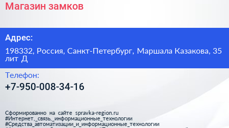 Магазин замков по адресу 198332, Россия, Санкт-Петербург, Маршала Казакова, 35 лит Д в дальнейшем Организация, размещена в следующих категориях: