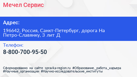 Мечел-Сервис по адресу 196642, Россия, Санкт-Петербург, дорога На Петро-Славянку, 3 лит Д в дальнейшем Организация, размещена в следующих категориях: